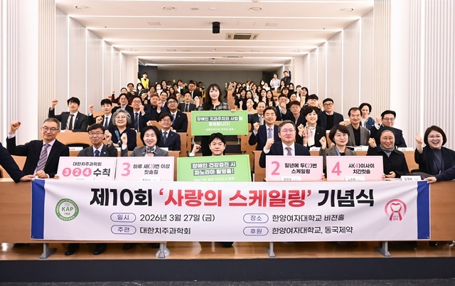 대한치주과학회(회장 설양조)가 지난 3월 27일 한양여자대학교 비전홀에서 ‘제10회 사랑의 스케일링’ 재능기부 기념식을 가졌다. 장애인 구강건강을 위해 시작된 이 행사는 어느덧 10년을 채웠고, 단순한 봉사를 넘어 ‘지속되는 관리’의 의미를 확인하는 자리로 이어졌다.