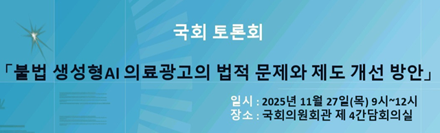 불법AI의료광고대응협의단은 오는 11월 27일(목) 오전 9시, 국회의원회관 제4간담회실에서 「불법 생성형 AI의료광고의 법적 문제와 제도 개선 방안」을 주제로 토론회를 개최한다고 밝혔다. 이번 행사는 김남희·전진숙·정진욱 의원(더불어민주당)과 협의단이 공동 주최한다.