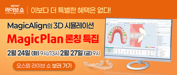 OSSTEM 라이브쇼는 오는 24일과 27일, 오스템임플란트의 투명교정장치 ‘매직얼라인’과 연계된 3D 치아이동 시뮬레이션 소프트웨어 매직플랜 특집 방송을 진행한다. 3월 30일 공식 출시를 앞둔 매직플랜이 외부에 공개되는 것은 이번이 처음이다.