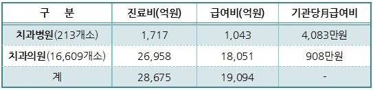 진료비에서 본인부담금을 뺀 급여비로 계산할 경우 치과병원은 기관당 월 4083만 원을, 치과의원은 기관당 908만 원을 각각 기록했다.