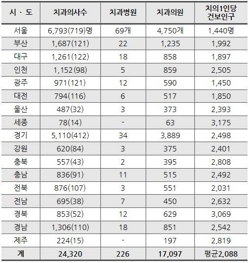 심평원에 등록된 활동 치과의사 숫자는 지난 연말에 비해 170명이 증가한 24,320명으로 집계됐다. 특히 치과 밀집도를 나타내는 치과의사 1인당 건보적용인구 수에서 서울, 광주, 대구 등 대도시 지역은 밀집도가 높게, 경북, 제주, 충북, 경남 등은 낮게 나타났다.