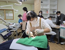 14일 일요일 아침 9시. 제2생활관 1층에 자리한 치과진료소 문이 열리자 아직 잠기가 덜 가신 '서울특별시립은혜로운집'의 하루가 조용히 시작된다. 유니트체어 세 대가 나란히 놓인 작은 공간이지만, 이곳은 매주 일요일이면 어김없이 사람들로 북적인다. (사)열린치과봉사회(회장 채규삼)가 2년째 이곳에서 봉사를 이어가고 있기 때문이다. 이날은 둘째 주 진료팀의 차례. 정돈영 원장(연세 크리스마스치과)과 기세호 원장(기세호치과)이 진료를 담당했고, 김용희 소장이 보철물 제작을, 베테랑 봉사자들인 송명진, 전만희, 조미순, 김선숙 선생이 스케일링과 체어사이드를 맡았다. 여기에 삼육대 치위생학과 김서진, 이세빈 학생까지.. 이미 오랜기간 손발을 맞춰온 봉사팀은 치과에 당도하자마자 누가 뭐랄 것도 없이 각자의 자리에서 각자 해야 할 일에 집중해 조용하고 빠르게 준비를 끝냈다. 이어 호명에 따라 약간은 불편한 걸음걸이의 환자들이 치과로 들어와 하나씩 체어를 차지하고 누웠다. 진료가 시작된 것이다. 이곳 은혜로운집은 정신건강에 어려움을 겪는 이들을 위한 정신요양시설이다. 2007년 설립돼 현재 124명이 이곳에서 생활하고 있는데, 진료 대상은 대부분 50대 이상의 남성 환