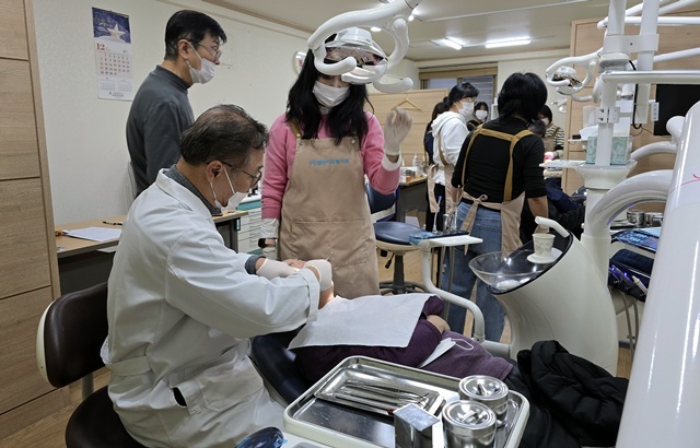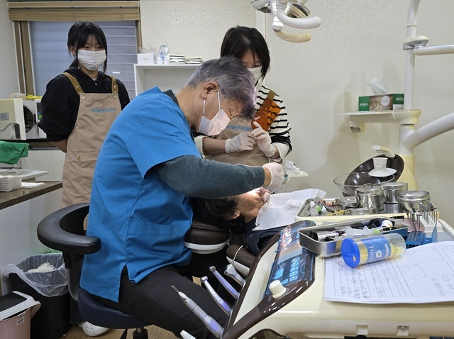 이미 오랜기간 손발을 맞춰온 봉사팀은 치과에 당도하자마자 누가 뭐랄 것도 없이 각자의 자리에서 각자 해야 할 일에 집중해 조용하고 빠르게 준비를 끝냈다. 이어 호명에 따라 약간은 불편한 걸음걸이의 환자들이 치과로 들어와 하나씩 체어를 차지하고 누웠다. 진료가 시작된 것이다.