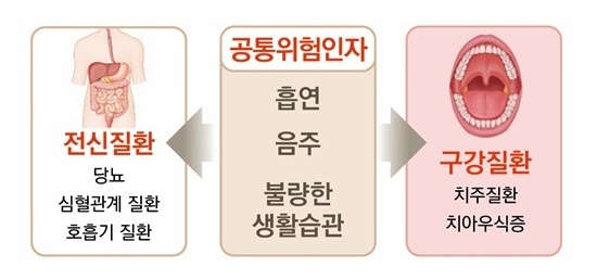 연구 결과들에 따르면 치주질환이 있는 경우 당뇨병(2형)은 1.5~2.3배, 심혈관 질환 1.1~2.4배, 만성호흡기질환 1.1~2.0배로 증가하는 것으로 보고되고 있으며, 세계보건기구(WHO)에서는 공통위험인자 조절을 통해 치주질환 및 전신질환의 통합적인 예방·관리에 적극적으로 앞장서고 있다.
