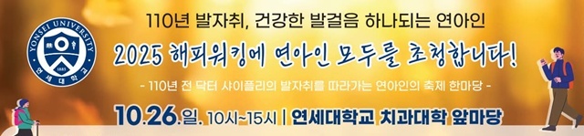 연세치대 동문회(회장 윤홍철) 주최 2025 연아 해피워킹데이가 오는 26일 오전 10시부터 연세치대 앞마당에서 열린다. 이날 개회식에 이어 동문, 가족 등 참가자들은 안산 봉수대정상까지 1시간반 여 코스를 걸으며 가을 정취를 만끽할 예정이다. 산행에 참가하지 않는 참석자들을 위해선 캠퍼스투어와 이벤트 및 부스관람 프로그램이 준비돼 있다.