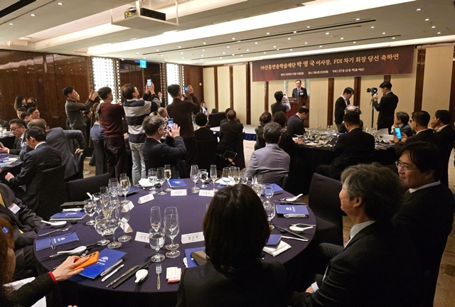 신흥연송학술재단 박영국 이사장의 FDI 차기회장 당선을 축하하는 모임이 지난 19일 웨스틴조선 호텔에서 열렸다.