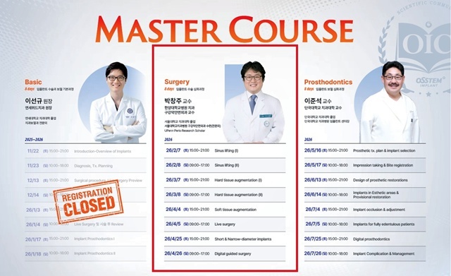 오스템임플란트가 오는 2월 7일 총 8회 과정으로 구성된 ‘마스터코스 수술 과정’을 개강한다. 이번 과정은 한양대학교병원 구강악안면외과 박창주 교수가 디렉터로 참여해 임플란트 식립부터 고난이도 수술까지 임상 노하우를 집중 전수한다.
