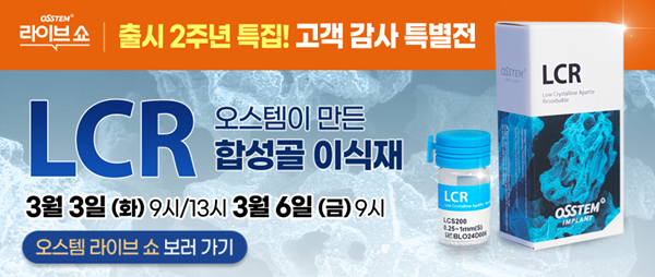 오스템임플란트가 개발한 합성골 이식재 LCR(Low Crystalline Apatite Resorbable)이 출시 2주년을 맞았다. OSSTEM 라이브쇼는 이를 기념해 3일부터 6일까지 고객 감사 특별전을 진행한다.