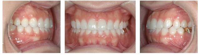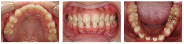 구강내과에 의뢰하여 턱관절 안정장치 치료를 받은 후 재내원 했을 때의 구내사진입니다. 초진사진과 비교하여 교합상태가 많이 변한 모습을 볼 수 있습니다. 이런 환자를 초진시의 교합상태를 기준으로 치료계획을 세운다면 치료과정에서 매우 당황스런 상황에 처하게 됩니다. 턱관절이 안정된 상태에서 재진단하여 치료계획을 수정한 후 치료를 진행한 경우입니다.
