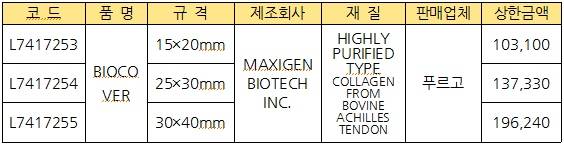 합성골은 바이오알파의 베타-TCP ‘EXCELOS INJECT’ 0.45g이 36,350원에 등재됐고, 맴브레인은 푸르고의 ‘바이오커버’가 규격에 따라 103,100원(15×20mm)에서 196,240원(30×40mm)으로 보험가가 매겨졌다.