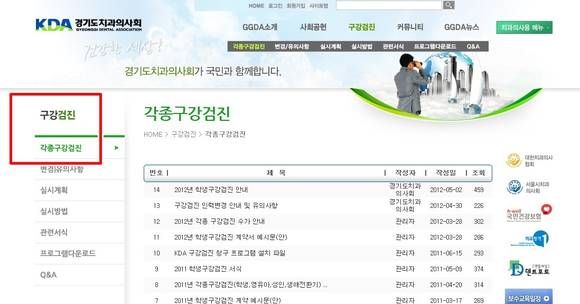 경기도의사회(회장 전영찬)는 구강검진 코너를 크게 마련해 변경 및 유의사항, 실시계획, 실시방법, 관련서식. 프로그램다운로드 등 각종 구강검진에 대한 안내 서비스를 제공하고 있다. 경기치의 관계자는 “회원들의 관심이 커지고 문의가 많아져 2011년도부터 별도 카테고리를 마련하게 됐다”며 “변화된 정부 시책 등 관련 내용을 매년 업데이트 하면서 회원들이 유용하게 활용하고 있는 중”이라고 밝혔다.
