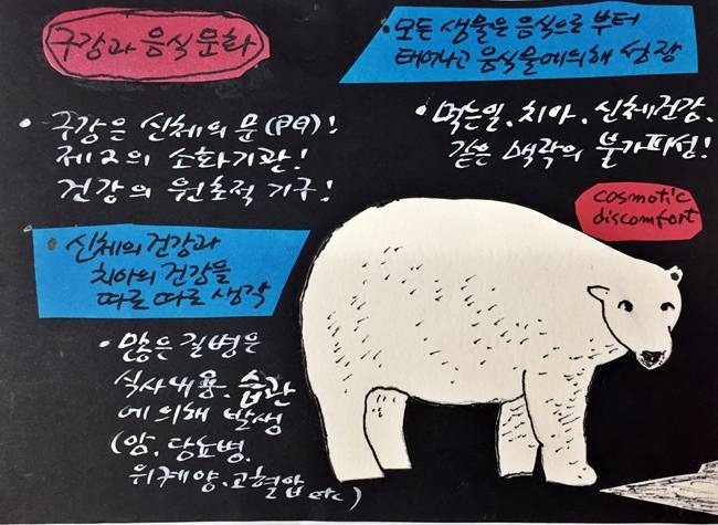 음식물(영양소)이 건강의 원초적 단위라면 그 단위를 전 단계 처리 조정하는 방(房)이 아니라 구강(口腔)이다. 따라서 구강의 중요성도 그만치 강조되어야 할 것이다. 음식물에 대한 인간의 자세는 「감사」하는 마음이다. 훌륭한 음식을 감사한 마음으로 먹는다는 것은 인간과 자연의 결합을 의미하고 자연이 인간ㅇ르 잘 부양하고 있음을 증명하는 현상이다.