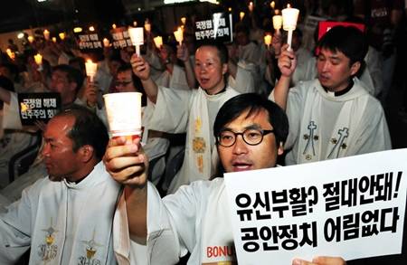 사제 제복을 걸쳤을 뿐 제주 해군기지·FTA·미국산 쇠고기·연평도 포격사건 등 사사건건 흔한‘시민단체’ 급으로 나서는 좌편향은, 대척점에 서는 우 편향 단체의 탄생과 분노와 저항을 자초하였다. J 일보 칼럼을 쓴 논설위원은, 실제로 무례를 저지르는 경우도 젊은이보다 노인이 많고, 시위현장에 가스통이나 쇠파이프를 들고 나타나는 것도 장 노년층이며, 젊은이들의 ‘노인 충(蟲)’이라는 넌더리를 이해한다고 썼다.