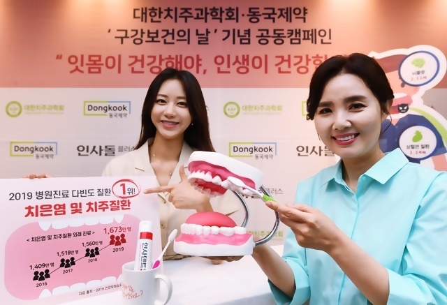 대한치주과학회(회장 구영)와 동국제약(대표이사 오흥주)이 지난 9일(화) 중구 더플라자 호텔에서 ‘구강보건의 날'을 기념하는 잇몸건강 공동 캠페인을 개최했다. ‘잇몸이 건강해야 인생이 건강합니다’를 슬로건으로 진행된 이날 캠페인은 '정상적인 식사를 가능케 하는 튼튼한 잇몸이 행복한 삶을 가꾸는데 필수'라는 것을 알리기 위해 마련한 행사로, 현장에선 잇몸병과 전신질환의 관계를 보여주는 제작물들이 눈길을 끌었다.